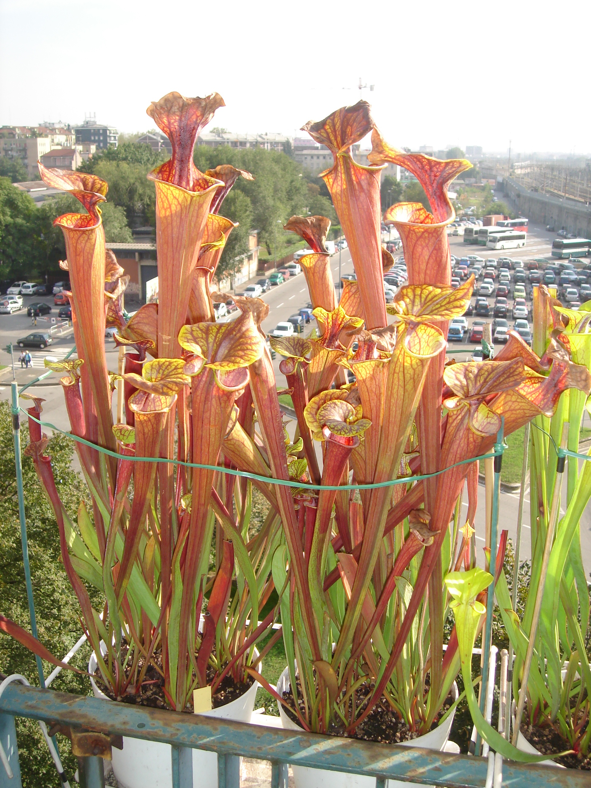 LUGLIORicevo la prima email di Mario Beretta. Lo conoscevo già da un po', mi faceva sempre mille domande sulle Nepenthes, ma ora finalmente ha un indirizzo email. Due dettagli di interesse: 1) a volte ordinavo all'estero e Mario si aggiungeva, e qui ho cercato a memoria di togliere le piante che aveva ordinato lui dai miei elenchi; 2) i cloni che proprio non ne volevano sapere di crescere li regalavo a Mario, che faceva esperimenti estremi per vedere di recuperarli. Quello che neanche lui riusciva a recuperare lo donava all'Orto Botanico Città Studi (Milano), dove oggi fa il giardiniere e che penso abbia ancora alcune di quelle piante. GIUGNO Arrivano le prime foto digitali, tutte nel periodo maggio-luglio. Mentre ero via, i miei sono andati a Orticola e hanno comprato da Furio Ersetti alcune carnivore per loro capriccio, come se lo spazio in casa già non fosse un problema. Tutte queste vengono relegate nella trascurata zona 8: S. rubra, S. leucophylla, S. purpurea, S. x mitchelliana, D. capensis, D. binata e D. aliciae (le drosere sono ridotte male). Ho una foto di H. nutans dalla stessa zona ma non sono sicuro dell'anno. Dalla zona 1 e 2: S. flava